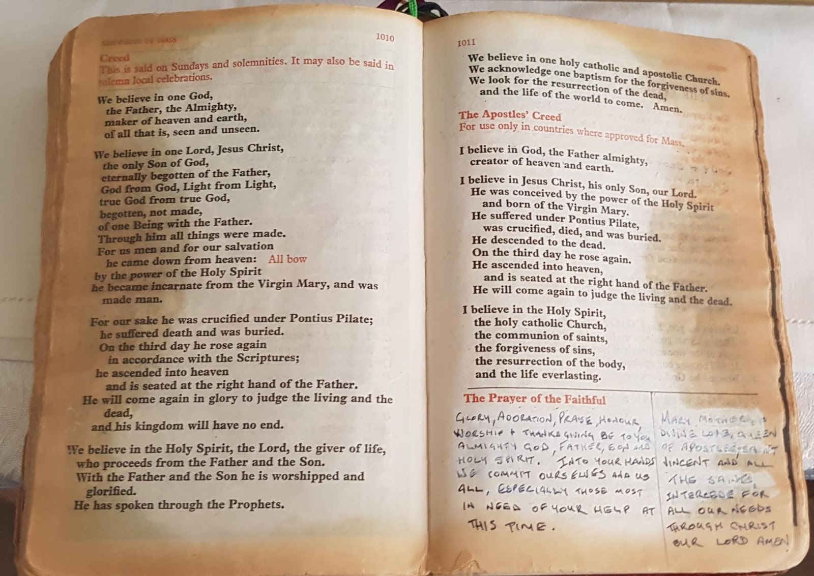 At the end of Mass I was given his Missal to keep and I will treasure this greatly because it is so lived in, its edges gone brown with age, the sweat of him that has coloured these sacred pages. And there are prayers written here that he used to say that will remind me of the tone of his praying voice, the expression in his eyes: